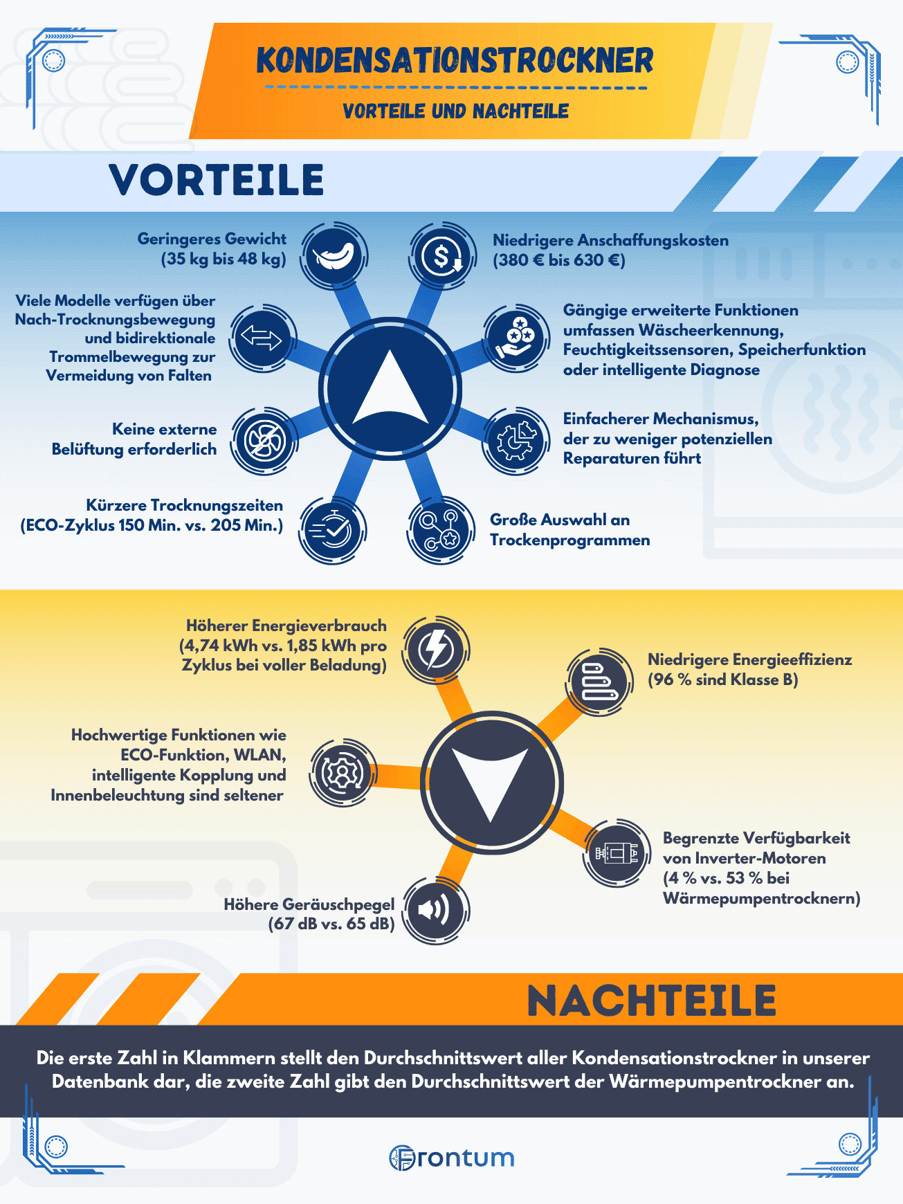 - Weniger Inverter-Motoren: Nur 4% der Kondensationstrockner verfügen über einen Inverter-Motor, verglichen mit 53% bei Wärmepumpenmodellen.