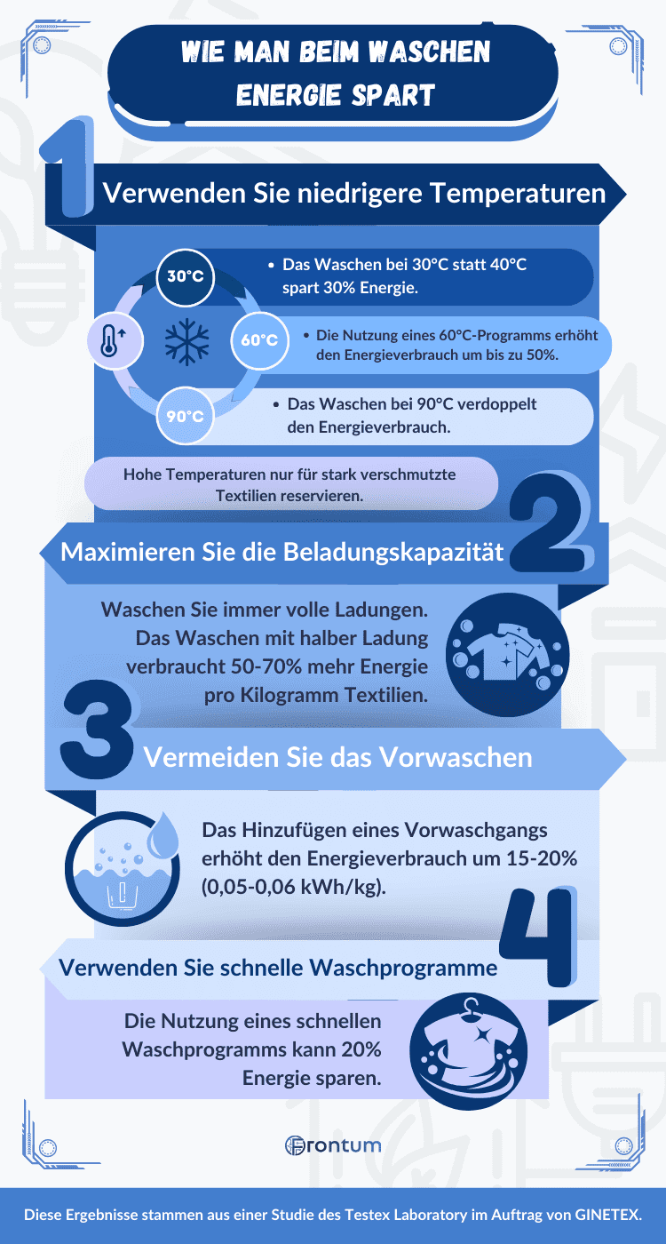 Eine Studie des Testex Laboratory für GINETEX hat gezeigt, dass das Waschen bei 30°C statt 40°C eine Energieeinsparung von 30% bewirkt. Im Gegensatz dazu kann das Waschen bei 60°C den Energieverbrauch um bis zu 50% erhöhen, und bei 90°C kann er sich mehr als verdoppeln. Hohe Temperaturen sollten daher für besonders stark verschmutzte Wäsche vorbehalten sein.